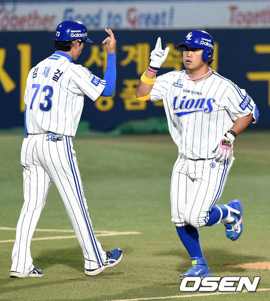 4회말 1사 1루에서 삼성 박석민이 좌중월 투런 홈런을 치고 김재걸 코치와 하이파이브를 하고 있다.