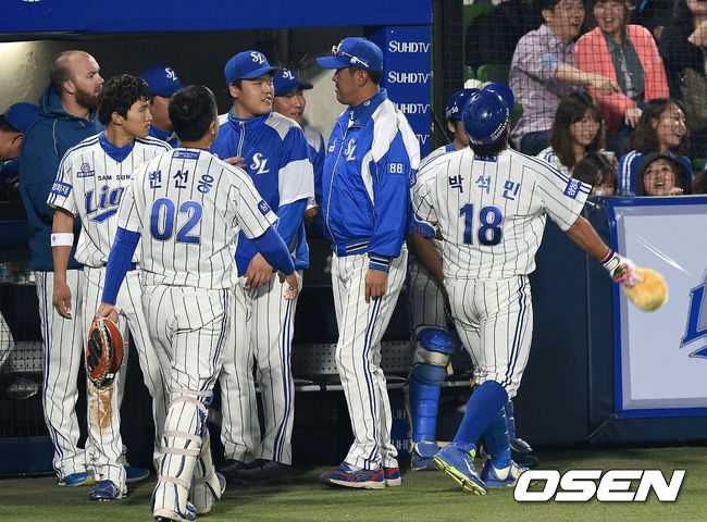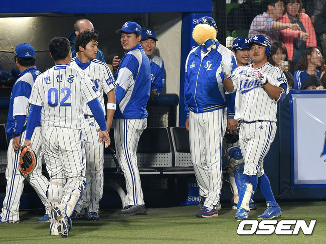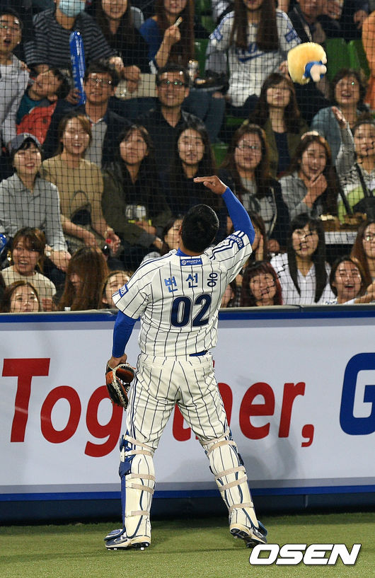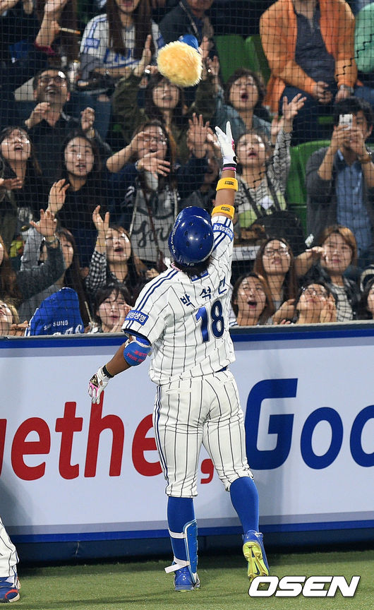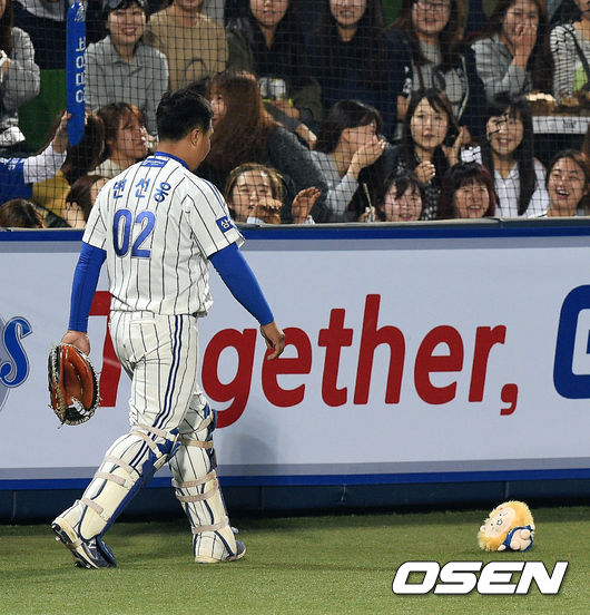 4회말 1사 1루에서 삼성 박석민이 좌중월 투런 홈런을 치고 팬들에게 홈런 인형을 던졌지만 두번이나 그물을 맞고 나오자 팀동료가 던져주고 있다.