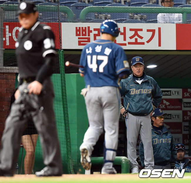 28일 오후 인천SK행복드림구장에서 열린 '2015 타이어뱅크 KBO 리그' SK 와이번스와 NC 다이노스의 경기 7회초 무사 1루 나성범이 번트를 치고 달리는 중 자신의 타구에 다시 맞아 수비방해로 인한 아웃이되자 김경문 감독이 그라운드로 올라와 항의 하려는 제스처를 취하고 있다.