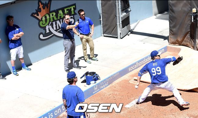 29일(이하 한국시간) 미국 캘리포니아주 로스앤젤레스 다저스타디움에서 열리는 '2015 메이저리그' LA 다저스와 샌프란시스코 자이언츠의 경기를 앞두고, 류현진이 불펜 피칭을 하고 있다.