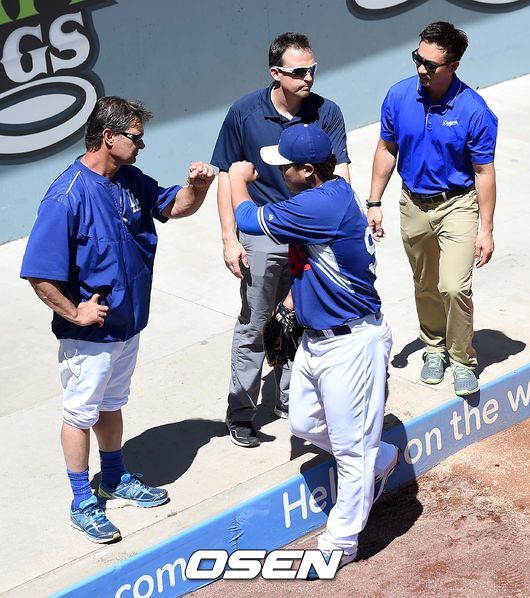 29일(이하 한국시간) 미국 캘리포니아주 로스앤젤레스 다저스타디움에서 열리는 '2015 메이저리그' LA 다저스와 샌프란시스코 자이언츠의 경기를 앞두고, 류현진이 불펜 피칭을 마치고 매팅리 감독과 인사를 나누고 있다.