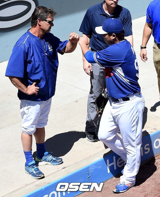 29일(이하 한국시간) 미국 캘리포니아주 로스앤젤레스 다저스타디움에서 열리는 '2015 메이저리그' LA 다저스와 샌프란시스코 자이언츠의 경기를 앞두고, 류현진이 불펜 피칭을 마치고 매팅리 감독과 인사를 나누고 있다.