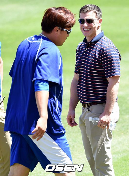 29일(이하 한국시간) 미국 캘리포니아주 로스앤젤레스 다저스타디움에서 열리는 '2015 메이저리그' LA 다저스와 샌프란시스코 자이언츠의 경기를 앞두고, 류현진이 불펜 피칭을 마치고 앤드류 프리드먼 다저스 야구부문사장과 인사를 나누고 있다.