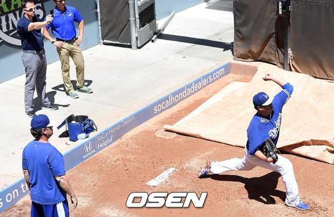 29일(이하 한국시간) 미국 캘리포니아주 로스앤젤레스 다저스타디움에서 열리는 '2015 메이저리그' LA 다저스와 샌프란시스코 자이언츠의 경기를 앞두고, 류현진이 불펜 피칭을 하고 있다.