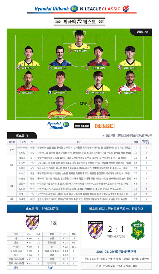 프로축구연맹은 29일 2015 현대오일뱅크 K리그 클래식 8라운드 최우수선수(MVP)로 아드리아노를 선정했다. 그는 지난 26일 수원 삼성(2-1 승)과의 경기서 2골을 기록하며 8경기 만에 대전에 마수걸이 승리를 안겼다.