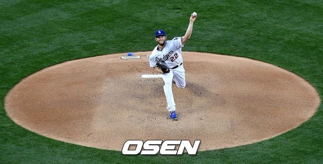 다저스 선발 클레이튼 커쇼가 힘차게 공을 뿌리고 있다.