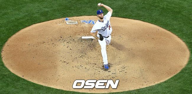 다저스 선발 클레이튼 커쇼가 힘차게 공을 뿌리고 있다.