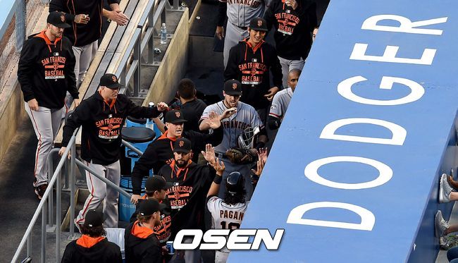 1회초 샌프란시스코 공격 2사 2루 상황 버스터 포지의 선제 1타점 적시타로 주자 앙헬 파간이 홈을 밟은 뒤 더그아웃 동료들과 인사를 나누고 있다.