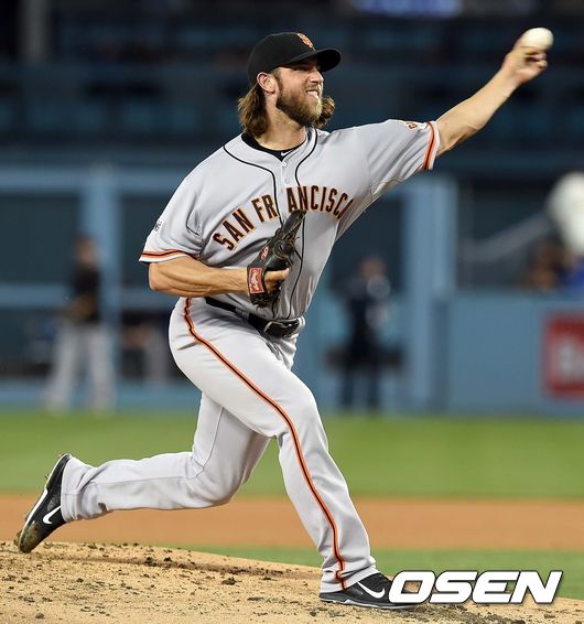 샌프란시스코 선발 매디슨 범가너가 힘차게 공을 뿌리고 있다.