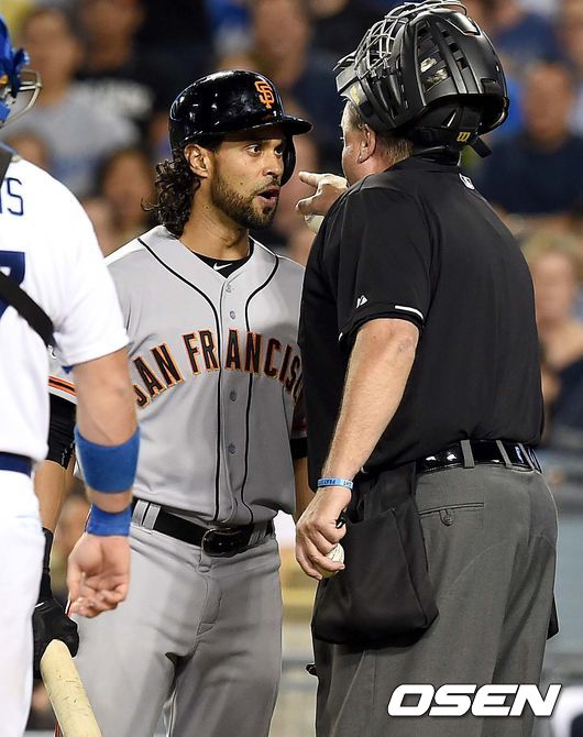 6회초 샌프란시스코 공격 선두타자로 나선 앙헬 파간이 헛스윙 아웃을 당한 뒤 심판과 격렬한 언쟁을 벌이고 있다.