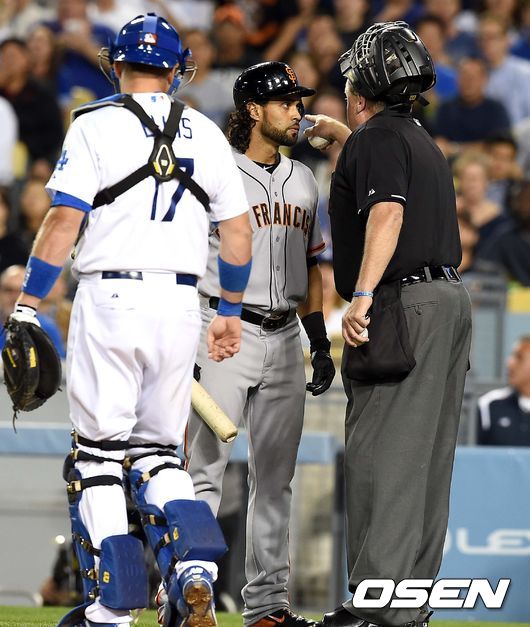 6회초 샌프란시스코 공격 선두타자로 나선 앙헬 파간이 헛스윙 아웃을 당한 뒤 심판과 격렬한 언쟁을 벌이고 있다.