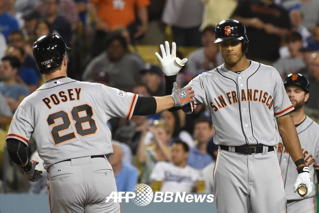 [OSEN=다저스타디움(LA 미국 캘리포니아주), 박승현 특파원]29일(이하 한국시간)다저스타디움에서 열린 샌프란시스코 자이언츠전에 선발 등판한 LA 다저스 투수 클레이튼 커쇼가 샌프란시스코 버스터 포지에게 단단히 혼났다.