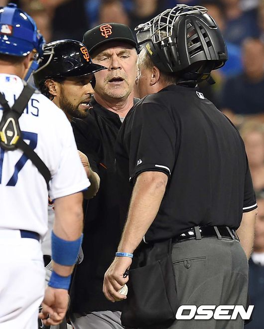 6회초 샌프란시스코 공격 선두타자로 나선 앙헬 파간이 헛스윙 아웃을 당한 뒤 심판과 격렬한 언쟁을 벌이고 있다. 이를 말리기 위해 벤치에서 급히 달려나온 샌프란시스코 브루스 보치 감독.