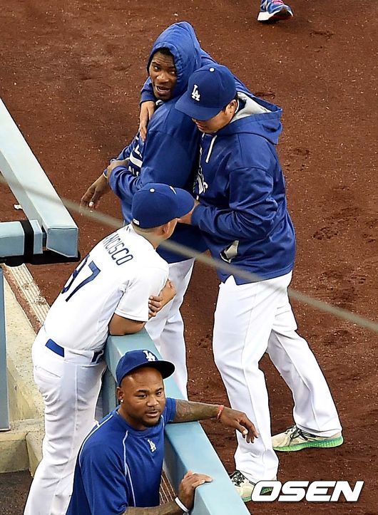 경기 시작을 앞두고 다저스 투수 류현진과 푸이그가 장난을 치고 있다.