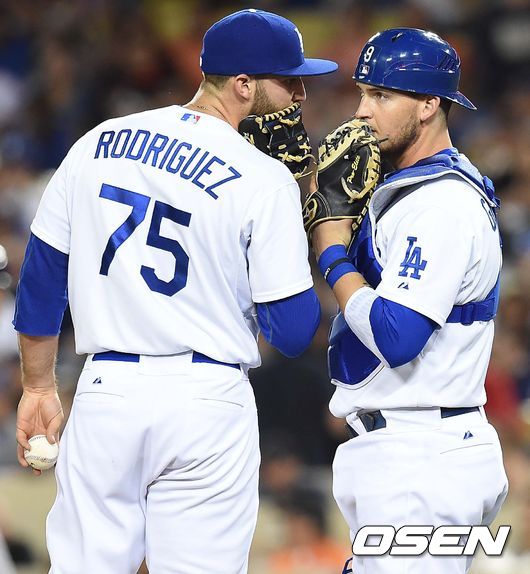 9회초 샌프란시스코 공격 1사 1, 2루 상황 다저스 투수 파코 로드리게스와 포수 야스마니 그란달이 대화를 나누고 있다./dreamer@osen.co.kr