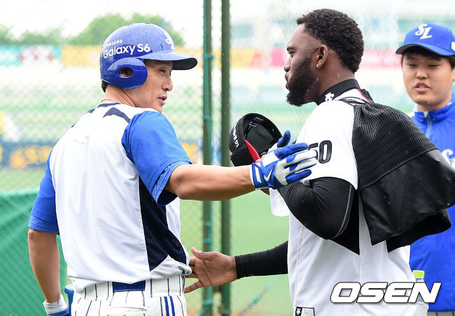 29일 오후 대구 시민운동장야구장에서 열릴 '2015 타이어뱅크 KBO 리그' 삼성과 LG의 경기에 앞서 삼성 이승엽과 LG 소사가 이야기를 나누고 있다.