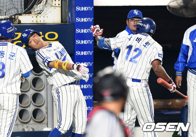 3회말 무사 1루에서 삼성 나바로가 좌중월 투런 홈런을 치고 더그아웃으로 가며 박석민과 세리머니를 펼치고 있다.
