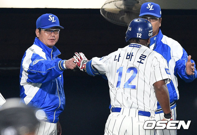 3회말 무사 1루에서 삼성 나바로가 좌중월 투런 홈런을 치고 더그아웃에서 류중일 감독과 하이파이브를 하고 있다.