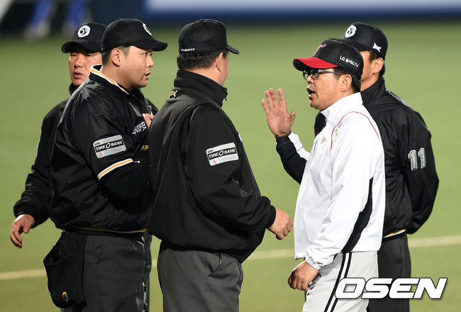 3회말 무사 1루에서 삼성 박석민의 몸에 맞는 볼때 김정국 주심이 LG 루카스에게 경고를 주자 양상문 감독이 그라운드를 방문. 강하게 어필하고 있다.