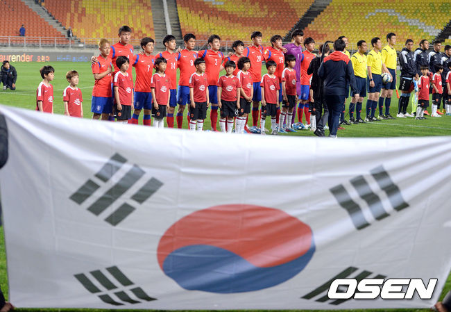 29일 오후 경기도 수원시 수원월드컵경기장에서 열린 '2015 수원 JS컵 U-18 국제청소년축구대회' 한국과 우루과이의 경기, 대표팀이 국민의례를 하고 있다.