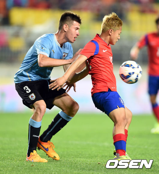 29일 오후 경기도 수원시 수원월드컵경기장에서 열린 '2015 수원 JS컵 U-18 국제청소년축구대회' 한국과 우루과이의 경기, 전반 이승우가 볼트래핑을 하고 있다.