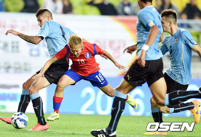 29일 오후 경기도 수원시 수원월드컵경기장에서 열린 '2015 수원 JS컵 U-18 국제청소년축구대회' 한국과 우루과이의 경기, 전반 이승우가 파울을 얻어내고 있다.