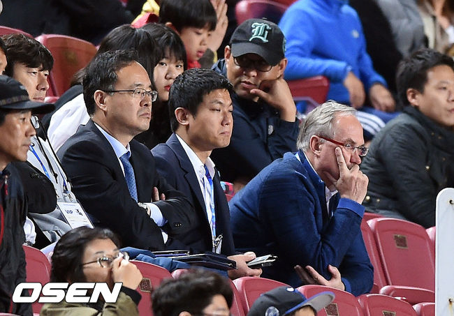 29일 오후 경기도 수원시 수원월드컵경기장에서 열린 '2015 수원 JS컵 U-18 국제청소년축구대회' 한국과 우루과이의 경기, 슈틸리케 축구대표팀 감독과 신태용 올림픽대표팀 감독이 경기를 관전하고 있다