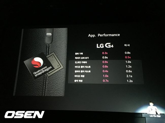 그러면서 타사와의 애플리케이션 실행 속도 비교표를 내보이며 G4와 타사가 큰 차이가 없으며 통화기록, 전후면 카메라, 비디오 및 갤러리 폴더 리스트, 비디오 재생, 음악재생 등의 앱 구동 속도는 오히려 더 빨랐다고 강조했다.