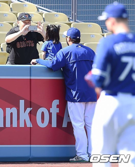 30일(이하 한국시간) 미국 캘리포니아주 로스앤젤레스 다저스타디움에서 열리는 '2015 메이저리그' LA 다저스와 샌프란시스코 자이언츠의 경기를 앞두고, 다저스 투수 류현진이 캐치볼 훈련을 앞두고 꼬마팬과 기념촬영을 하고 있다.