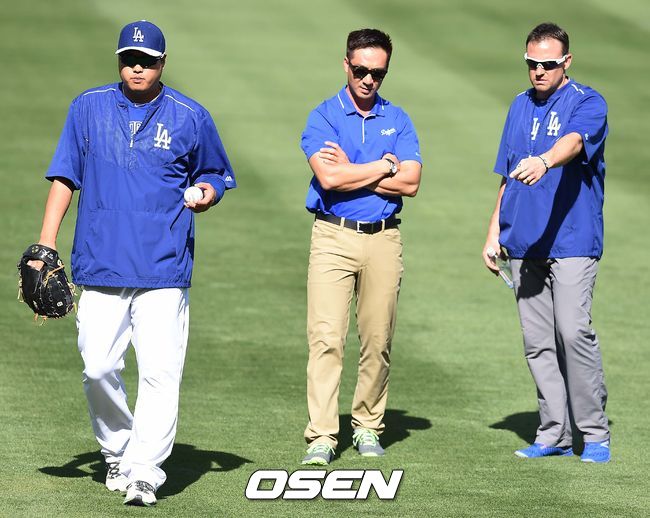 30일(이하 한국시간) 미국 캘리포니아주 로스앤젤레스 다저스타디움에서 열리는 '2015 메이저리그' LA 다저스와 샌프란시스코 자이언츠의 경기를 앞두고, 다저스 투수 류현진이 그라운드에서 캐치볼 훈련 중 트레이너에게 지시를 받고 있다.