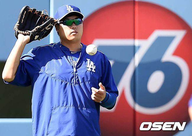 30일(이하 한국시간) 미국 캘리포니아주 로스앤젤레스 다저스타디움에서 열리는 '2015 메이저리그' LA 다저스와 샌프란시스코 자이언츠의 경기를 앞두고, 다저스 투수 류현진이 그라운드에서 캐치볼 훈련을 준비하고 있다.