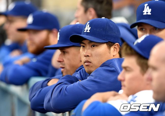 다저스 투수 류현진이 벤치에서 그라운드를 바라보고 있다.
