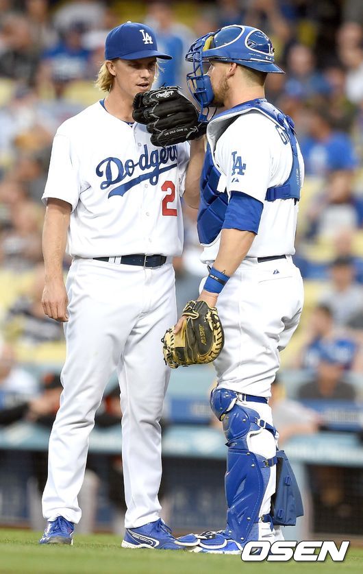 1회초 샌프란시스코 공격 2사 1, 2루 상황 다저스 선발 잭 그레인키와 포수 야스마니 그란달이 대화를 나누고 있다.