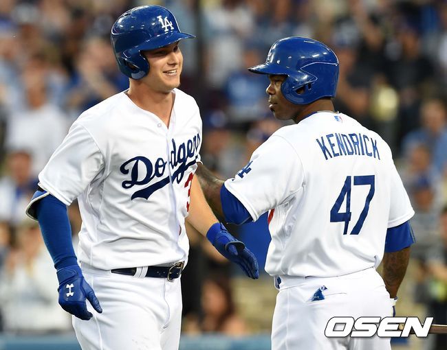 1회말 다저스 공격 선두타자로 나선 작 피더슨이 동점 중월 솔로포를 날리고 홈을 밟은 뒤 켄드릭과 인사를 나누며 기뻐하고 있다.