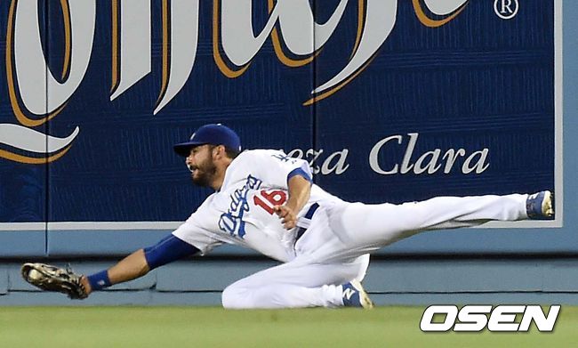 2회초 샌프란시스코 공격 2사 1, 2루 상황 조 패닉의 잘 맞은 타구를 다저스 우익수 안드레 이디어가 몸을 날리며 잡아내고 있다.