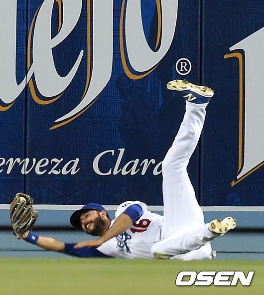 2회초 샌프란시스코 공격 2사 1, 2루 상황 조 패닉의 잘 맞은 타구를 다저스 우익수 안드레 이디어가 몸을 날리며 잡아내고 있다.