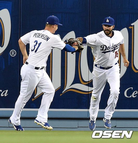 2회초 샌프란시스코 공격 2사 1, 2루 상황 조 패닉의 잘 맞은 타구를 다저스 우익수 안드레 이디어가 몸을 날리며 잡아낸 뒤 중견수 작 피더슨과 인사를 나누며 더그아웃으로 향하고 있다.