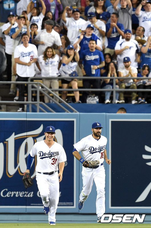 2회초 샌프란시스코 공격 2사 1, 2루 상황 조 패닉의 잘 맞은 타구를 다저스 우익수 안드레 이디어가 몸을 날리며 잡아낸 뒤 중견수 작 피더슨과 인사를 나누며 더그아웃으로 향하고 있다.
