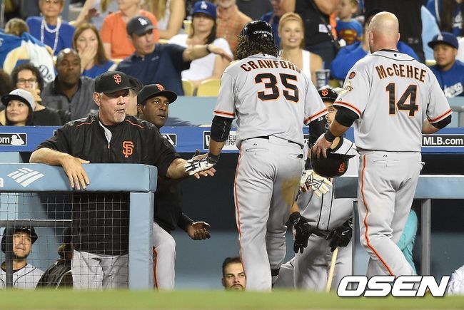 4회초 샌프란시스코 공격 무사 2루 상황 브랜든 크로포드가 투런포를 날리고 홈을 밟은 뒤 브루스 보치 감독과 인사를 나누고 있다.