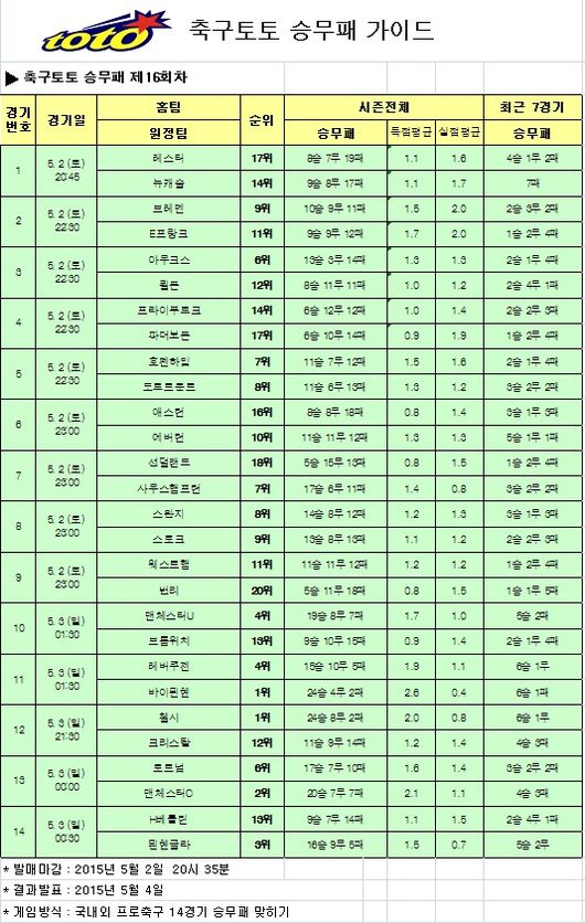 축구토토 승무패 16회차 게임은 내달 2일 오후 8시 35분에 발매가 마감되며 상세한 일정은 공식 인터넷 발매사이트 베트맨에서 일정을 확인할 수 있다.
