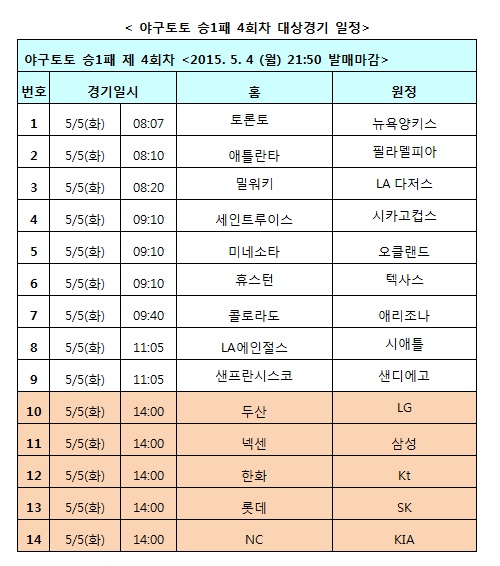 [야구토토] 국민체육진흥공단(www.kspo.or.kr)이 발행하는 체육진흥투표권 수탁사업자인 스포츠토토(www.sportstoto.co.kr)는 내달 5일에 벌어지는 국내 프로야구(KBO) 5경기 및 미국프로야구(MLB) 9경기 등 총 14경기를 대상으로 한 야구토토 승1패 4회차 게임을 발행한다고 밝혔다.