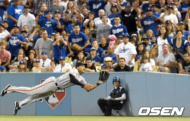 4회말 다저스 공격 무사 2, 3루 상황 그레인키의 플라이 타구를 샌프란시스코 우익수 맥스웰이 몸을 날리며 잡아내고 있다.