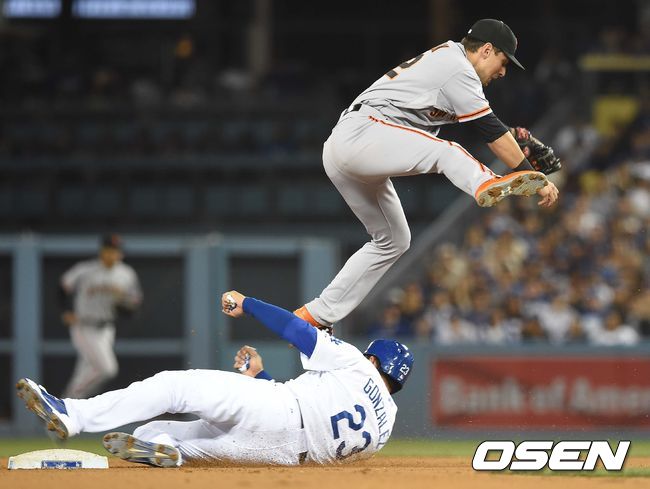 5회말 다저스 공격 1사 1루 상황 반 슬라이크의 병살타 때 샌프란시스코 2루수 조 패닉이 주자 아드리안 곤살레스를 포스아웃 시킨 뒤 1루로 송구하고 있다.