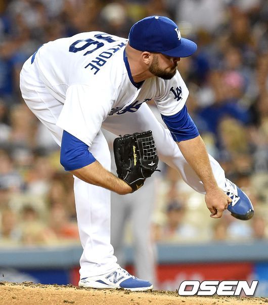 7회초 샌프란시스코 공격 때 마운드에 오른 다저스 투수 아담 리베라토어가 힘차게 공을 뿌리고 있다.