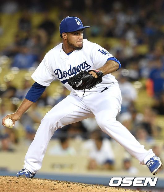 9회초 샌프란시스코 공격 때 마운드에 오른 다저스 투수 이미 가르시아가 힘차게 공을 뿌리고 있다.