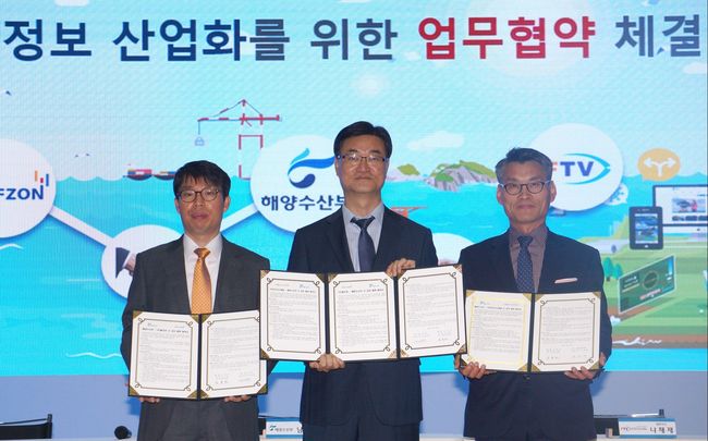 골프존은 30일 서울 삼성동 코엑스에서 해양수산부 국립해양조사원과 MOU를 체결했다. 골프존 장성원 대표이사와 해양수산부 남봉현 기획조정실장, 한국낚시채널 권범로 이사(왼쪽부터) 등이 협약서 서명 후 기념 촬영을 하고 있다. / 골프존 제공