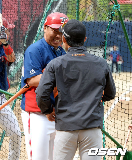 경기에 앞서 KIA 이범호가 한화 이용규와 전날 험버의 사구에 대해 이야기를 나누고 있다.