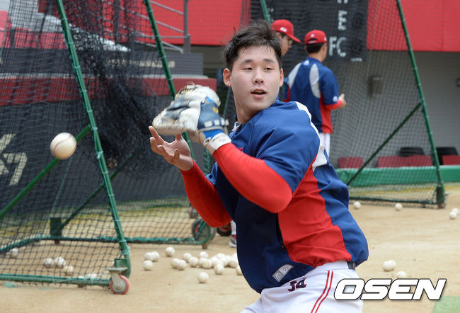 경기에 앞서 KIA 이홍구가 훈련을 하고 있다.