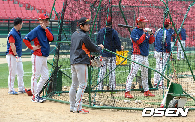 경기에 앞서 한화 이용규가 KIA 김기태 감독과 훈련을 지켜보고 있다.