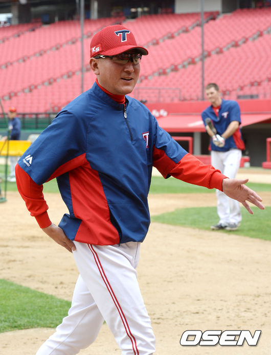경기에 앞서 KIA 김기태 감독이 미소를 지으며 훈련을 지켜보고 있다.
